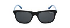 Κοκάλινα σε τετράγωνο σχήμα τα παιδικά γυαλιά ηλίου VOGUE JUNIOR 2008 συνδυάζουν αρμονικά την απόχρωση του μαύρου στην μετόπη με μπλε βραχίονες όπου συναντάμε το χαρακτηριστικό λογότυπο του οίκου.