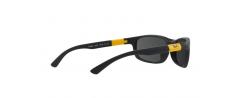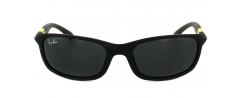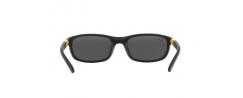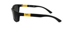 Σε ορθογώνιο σχήμα, τα γυαλιά ηλίου RayBan Junior 9056S 195/87 έχουν κοκάλινο σκελετό σε μαύρο ματ χρώμα και στην περιοχή του βραχίονα συναντούμε μια κίτρινη, λεπτή γραμμή