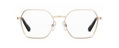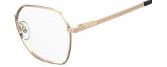 Με τετράγωνο σχήμα, τα κοκάλινα γυαλιά οράσεως Moschino Love 628 000, ξεχωρίζουν με την εντυπωσιακή χρυσή απόχρωση όπου κροταφικά συναντάμε το λογότυπο του οίκου.