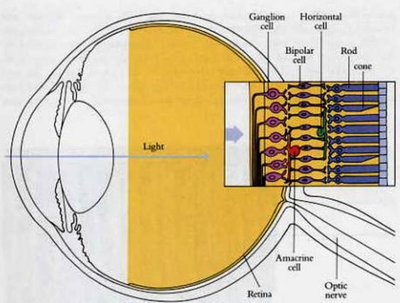 Η λειτουργία της όρασης εξαρτάται από τα φωτοευαίσθητα κύτταρα, τα κωνία και τα ραβδία που ευθύνονται για την όραση των χρωμάτων και την όραση στο ημίφως αντιστοιχα.